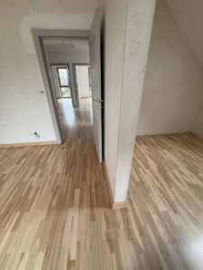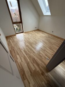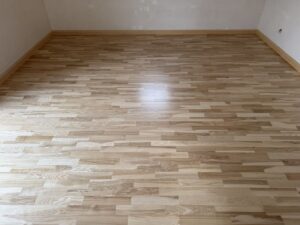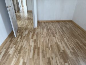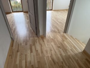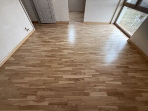 Wylewkę zagruntowaliśmy gruntem Uzin PE 404 ,następnie użyliśmy kleju Uzin MK 160 a parkiet wykończyliśmy lakierem podkładowym nie zmieniającym barwy Pallmann Pall-X 320 i nawierzchniowym Pallmann Pall-X Trend półmat.