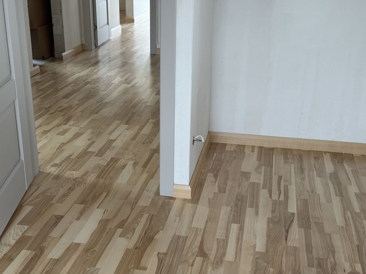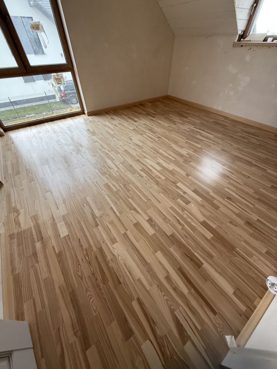 Wylewkę zagruntowaliśmy gruntem Uzin PE 404 ,następnie użyliśmy kleju Uzin MK 160 a parkiet wykończyliśmy lakierem podkładowym nie zmieniającym barwy Pallmann Pall-X 320 i nawierzchniowym Pallmann Pall-X Trend półmat.
